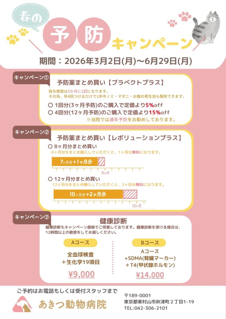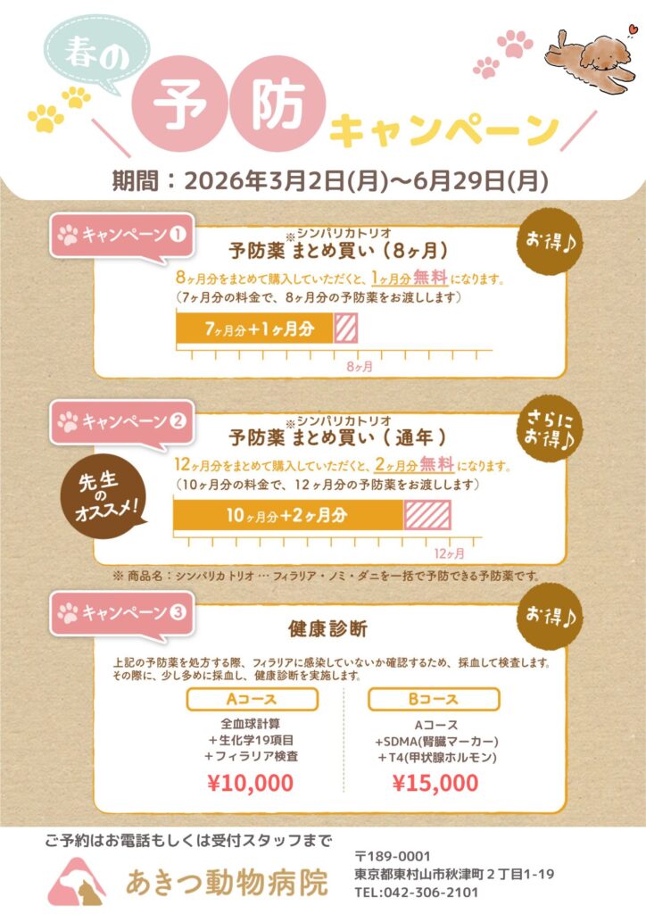 わんちゃん、ねこちゃんでそれぞれ春の健康診断、予防薬のキャンペーンを実施致します。